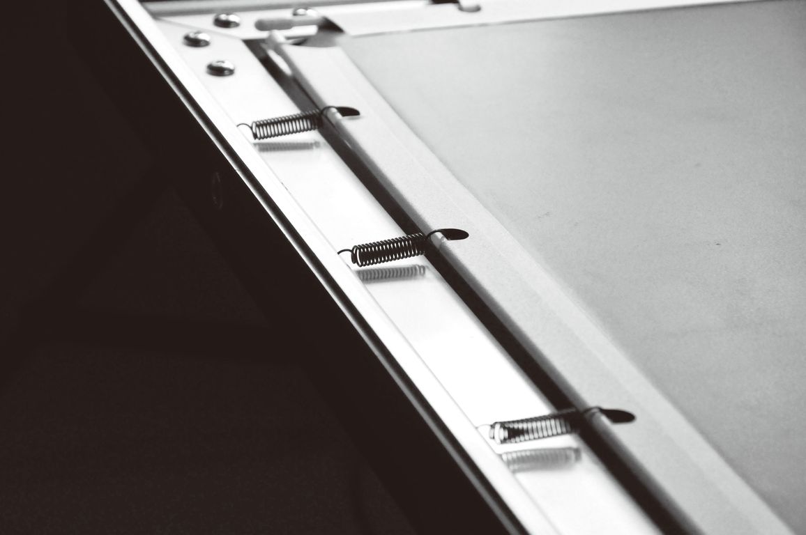 • Идеально плоское полотно с основой—материал PVC. Полотно равномерно натянуто по периметру рамки, что препятствует возникновению неровностей и волн во время эксплуатации.