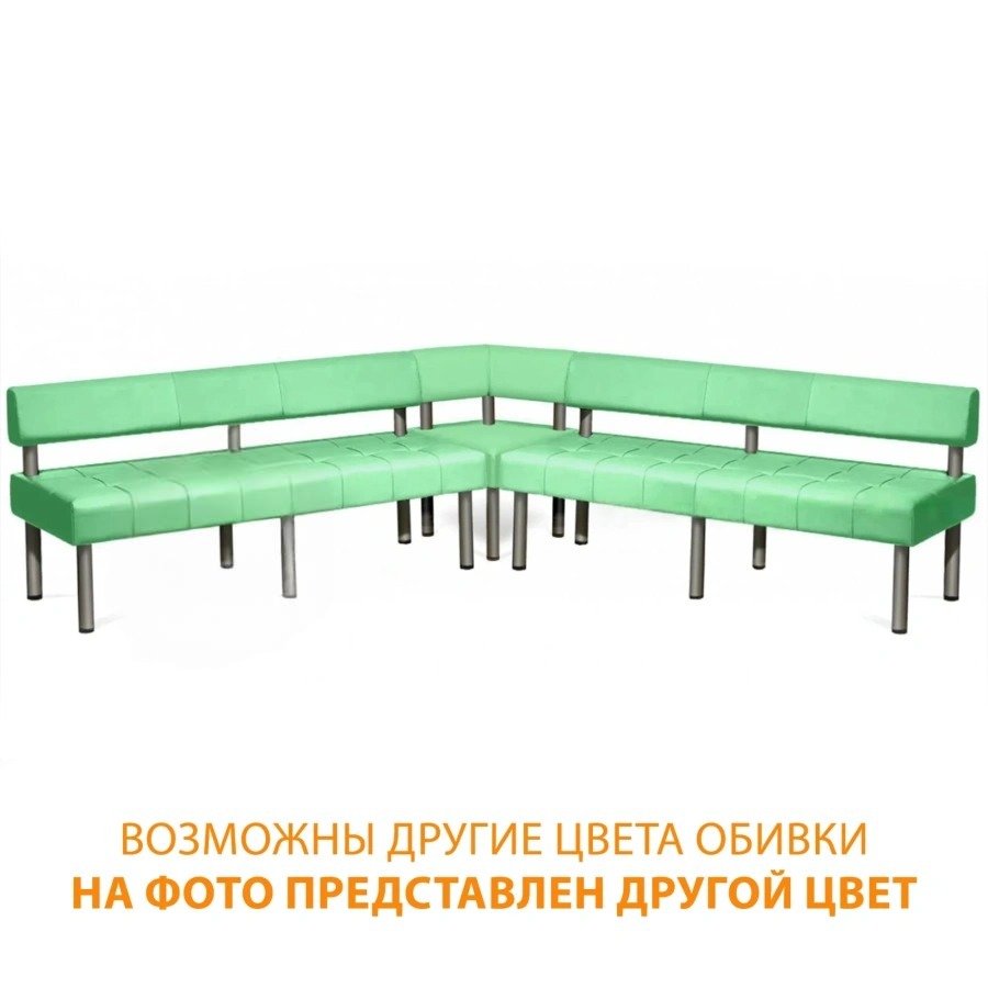 Дополнительную эстетику и практичность конструкции придают хромированные ножки диаметром 50 мм и высотой 300 мм, имеющие защитные пластиковые заглушки на каждом конце. Центральная часть набора оснащена прямым сиденьем толщиной 170 мм с утяжками, которые визуально украшают поверхность и поддерживают комфорт. Наклонная спинка с прямоугольной формой и фиксация частей на хромированные опоры обеспечивают неизменность формы и длительную эксплуатацию. Вся продукция выпускается в полностью собранном виде, что заметно упрощает процедуру ввода в эксплуатацию и последующего обслуживания.