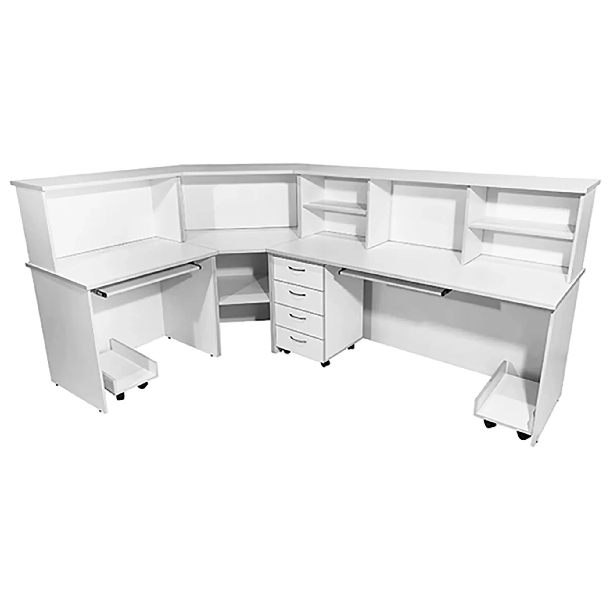 Стол-пост медицинский MD СтП 11.03 (белый) — это надежное и функциональное угловое решение для создания удобного рабочего места администратора в медицинских учреждениях. Модель выполнена из ЛДСП, имеет надстройку с полками, подкатную платформу для системного блока, полки для клавиатуры слева и справа, а также тумбу с четырьмя выдвижными ящиками и дополнительными полками.
