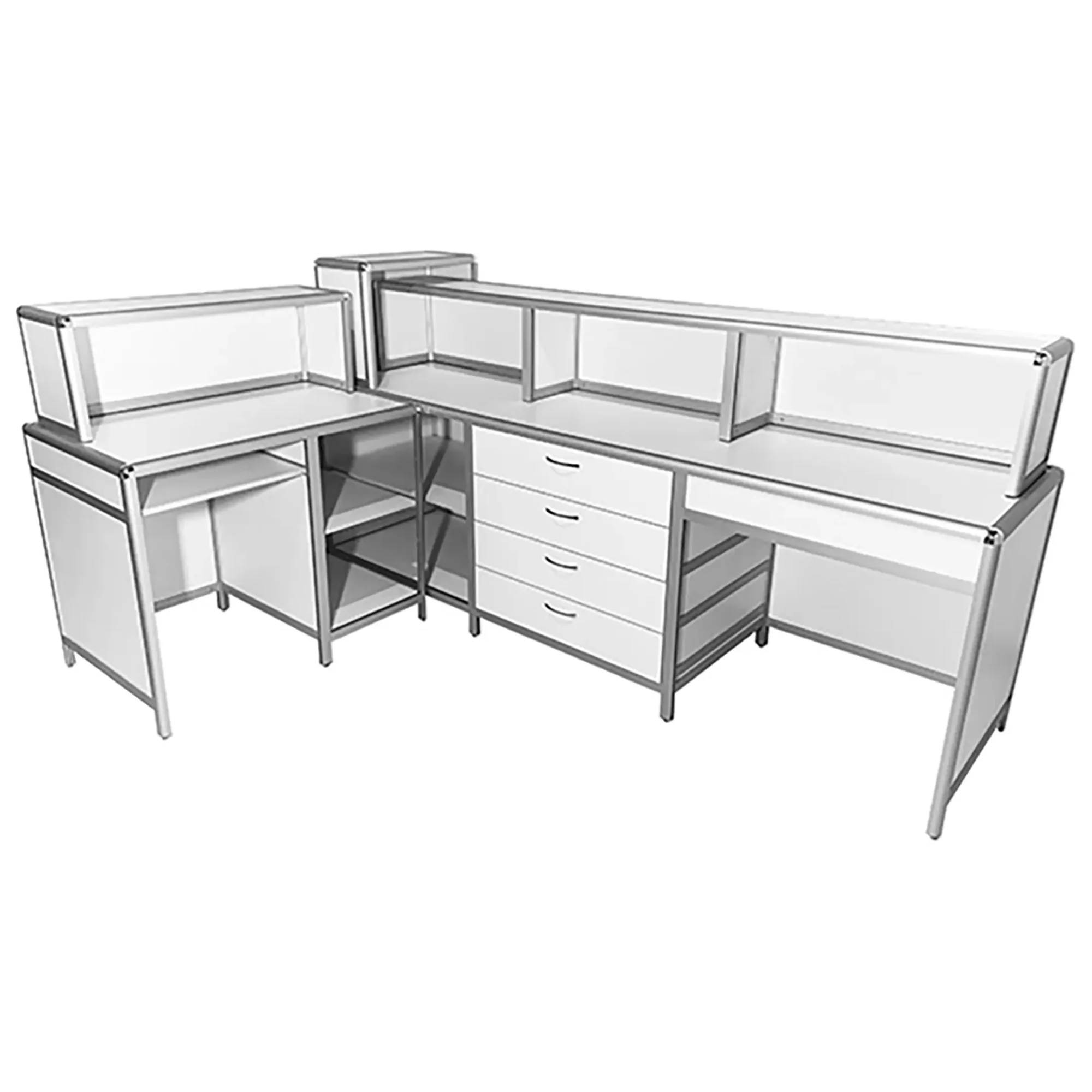 - Качественные материалы — обшивка из ЛДСП 8 мм, столешницы из ЛДСП 16 мм белого цвета, устойчивые к влажной уборке и обработке дезинфицирующими средствами.