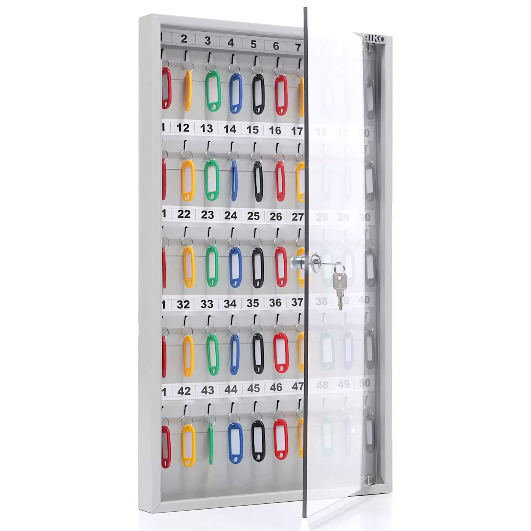 - Оптимальная вместимость для рабочих мест и точек доступа — система рассчитана на 50 ключей, что идеально подходит для организации хранения на стойке администратора, в диспетчерской, на посту охраны или в отделе, где требуется систематизировать и контролировать значительный набор ключей.