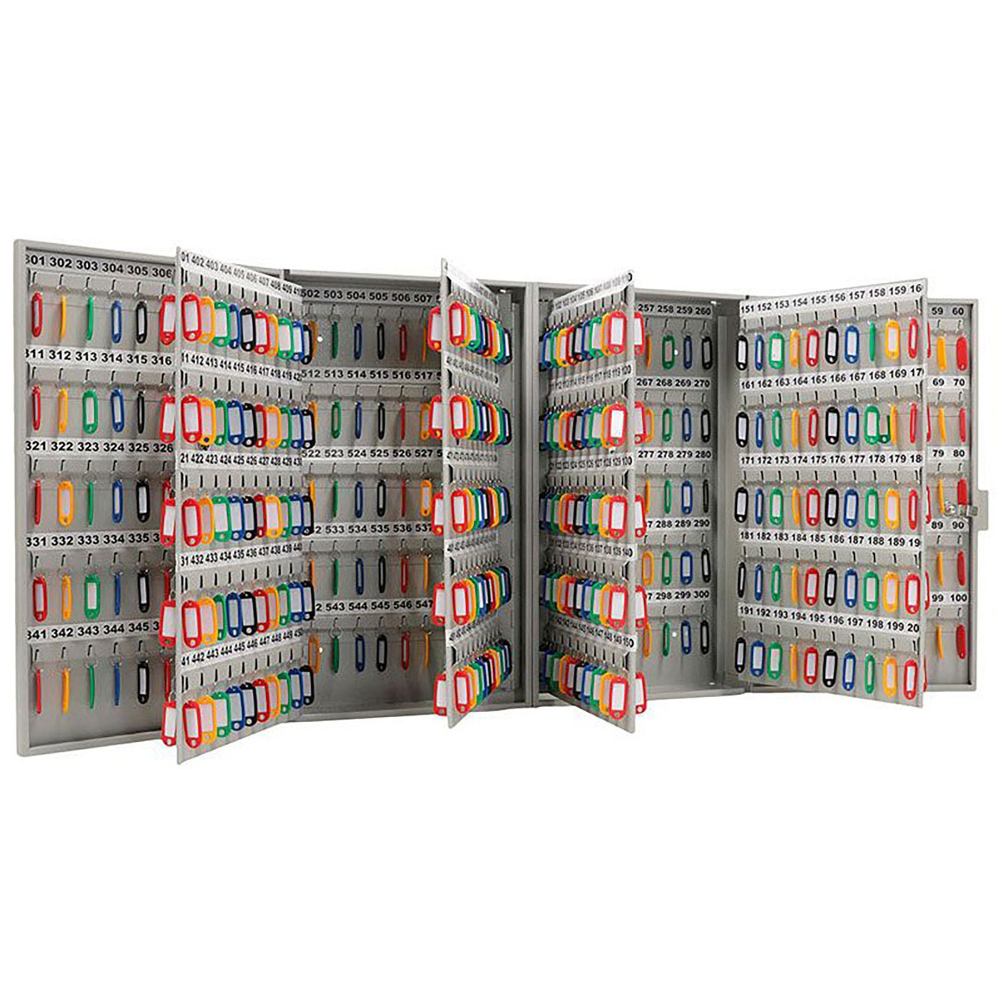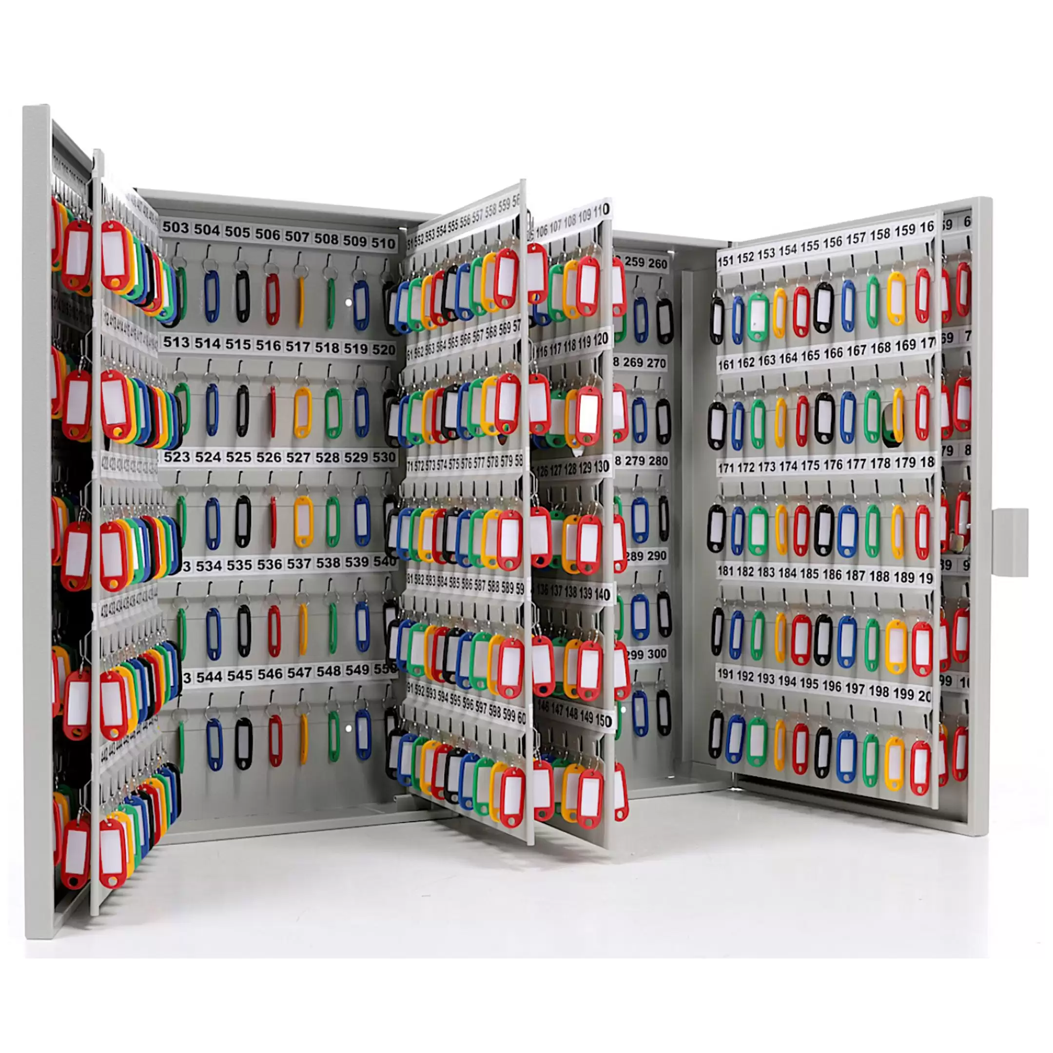 Ключница KEY-600 (с брелками) — это масштабная и профессиональная система для централизованного управления, учета и хранения чрезвычайно большого количества ключей на особо крупных объектах, в головных офисах управляющих компаний, на промышленных гигантах и в распределенных сетях. Модель представляет собой крупногабаритный металлический шкаф (часто напольный или модульный), где обозначение «KEY-600» прямо указывает на её экстремальную вместимость (600 ключей), а комплектация «с брелками» включает полный промышленный набор номерных держателей. Конструкция предназначена для создания главного узла ключевого хозяйства, обеспечения безусловного порядка, максимальной безопасности и интеграции в сложные системы электронного документооборота и контроля доступа.