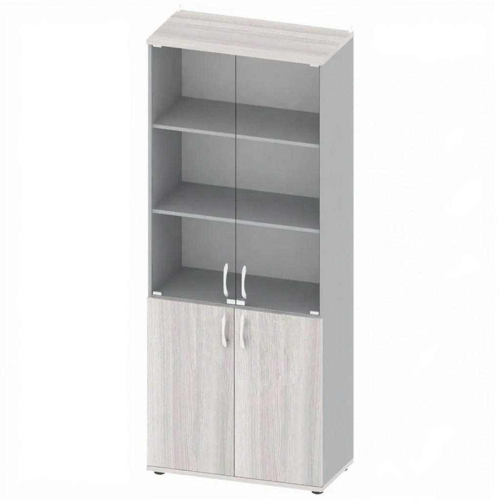 - Комбинированное остекление — 2 двери из ЛДСП для хранения материалов, не требующих обзора, и 2 стеклянные двери для демонстрации содержимого.