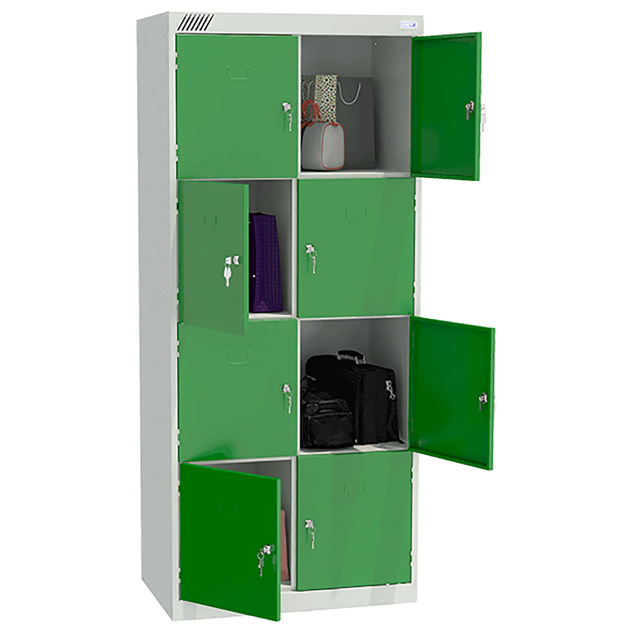 - Вместительная конструкция — две секции и восемь ячеек обеспечивают индивидуальное хранение для нескольких человек.