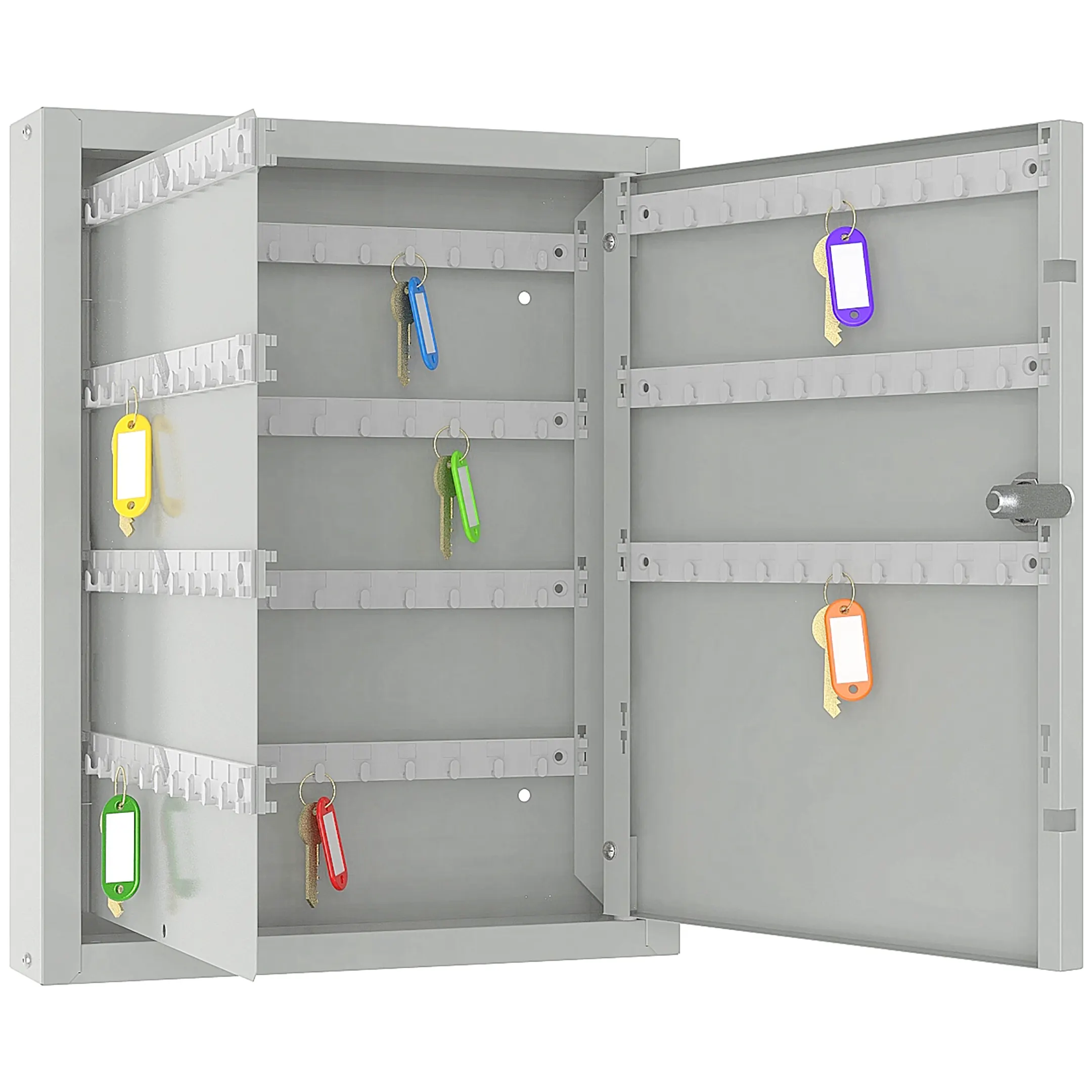 - Удобство эксплуатации и эргономика — модель, как правило, спроектирована с учетом удобства работы: панели с крючками могут быть статичными или выдвижными, обеспечивая отличный обзор и легкий доступ ко всем ключам. Комплектные брелки упрощают манипуляции, экономя время персонала.