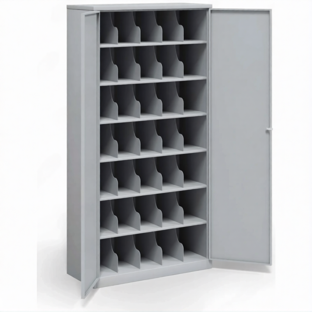 • 35 ячеек, две дверцы, скошенные полки для удобства хранения СИЗ.