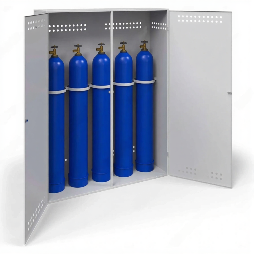 - Оптимальная вместимость и компактность для малого бизнеса — шкаф идеально подходит для небольших мастерских, автосервисов, строительных бригад или производственных участков, где одновременно используется до пяти газовых баллонов. Его габариты позволяют удобно разместить баллоны, обеспечивая к ним доступ, без излишнего занимания полезной площади помещения.