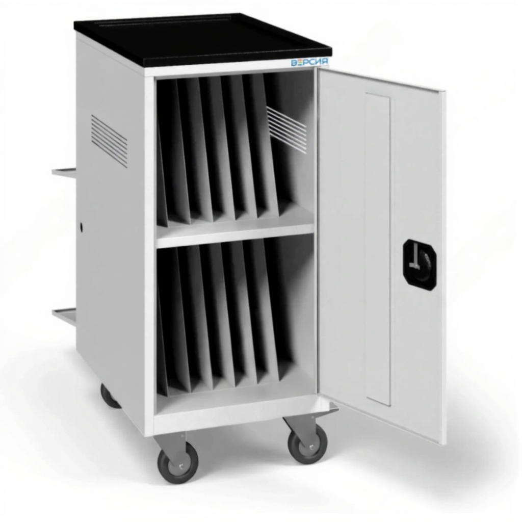 - Интегрированная система зарядки — оснащена системой управления питанием для одновременной зарядки всех ноутбуков от одной розетки, с защитой от перегрузок и контролем процесса, что гарантирует их полную готовность к работе.
