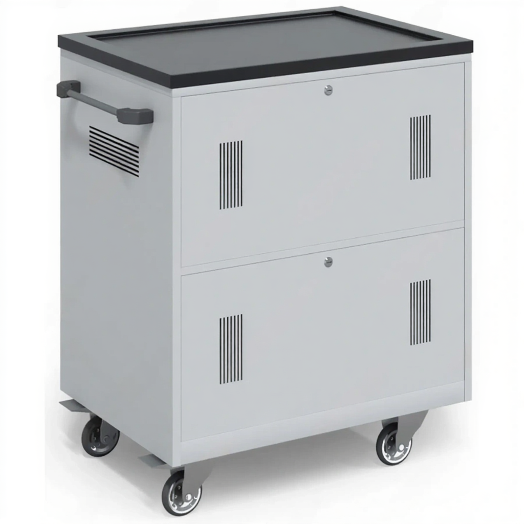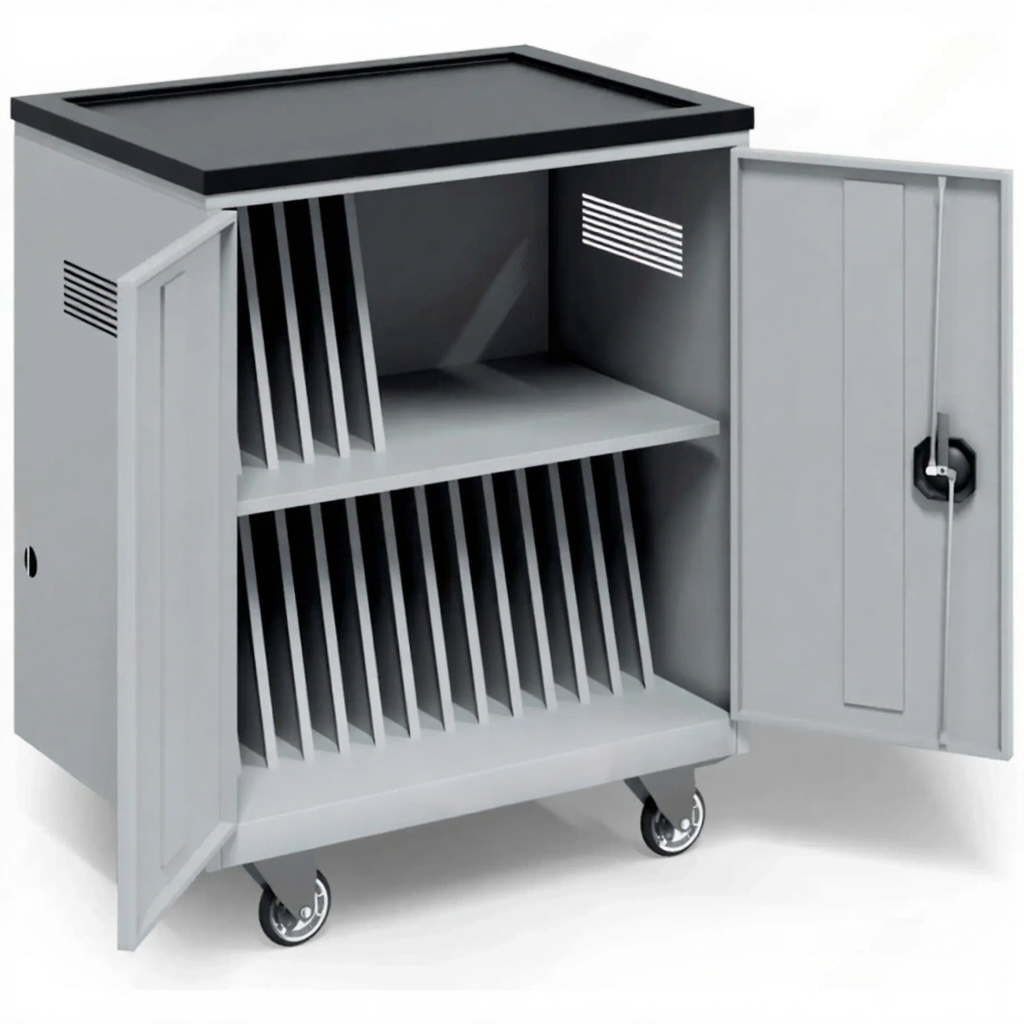 - Надежная защита и организация — прочный корпус с запирающимися дверцами защищает технику от кражи и повреждений. Каждый ноутбук имеет свое закрепленное место, что предотвращает хаос и ускоряет процесс раздачи и сбора.