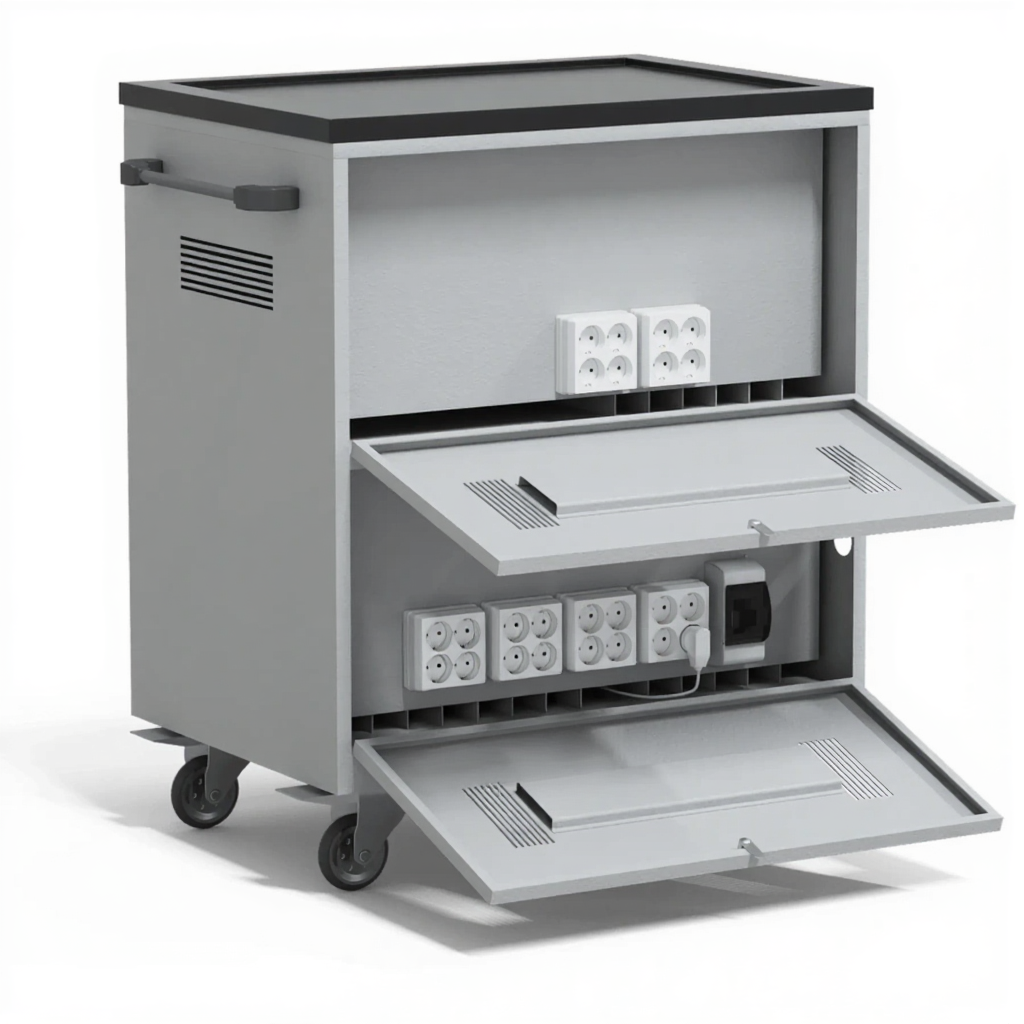 - Интеллектуальная и безопасная зарядка — встроенная электросхема обеспечивает синхронную зарядку всех 21 устройств от одной розетки, с автоматическим распределением нагрузки, защитой от перегрева и перепадов напряжения, что продлевает срок службы аккумуляторов.