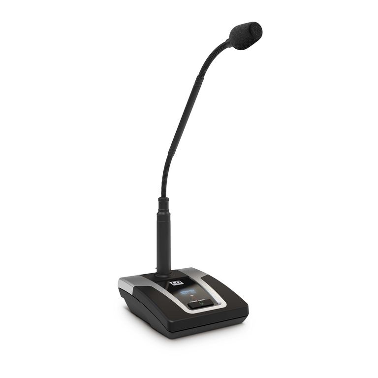 Настольные базы оснащены конденсаторным микрофоном на гусиной шее с гиперкардиоидной диаграммой направленности и световым кольцом индикации. База с микрофонным входом XLR, фантомным питанием 28 В, переключателем включения / выключения, а также регулятором усиления и выбираемым фильтром высоких частот 130 Гц для речи. На высококонтрастном OLED-дисплее отображаются радиочастота, состояние батареи, номера пультов, группа и канал. Частотный диапазон конференц-системы составляет 60 Гц - 16 кГц.